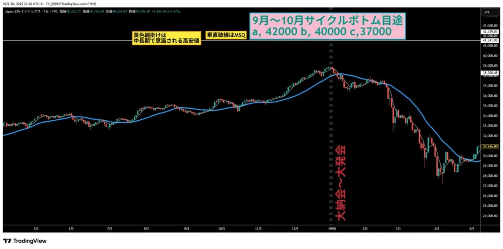 1990年時の高値は年末の大納会~大発会のタイミングでした。その後、25日線を割りこんだ後のリバウンドで25日線に高値が押さえ込まれそのまま約30%の下落を演じました。
