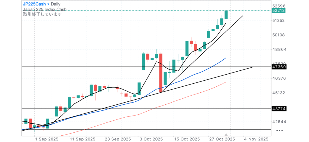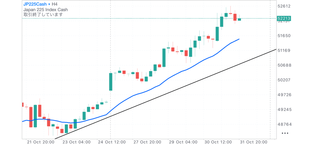 繰り返しになりますが、トレンドが加速中でも高値掴みはNGです。10/20のような包み陰線がいつでるかはわかりません。出来高がスカスカで需給は偏っていますのでボラは高まりやすい環境です。