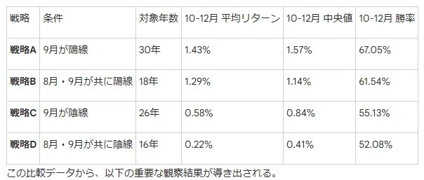 • 明確な分岐点: 9月が陽線であったか陰線であったかによって、その後の10-12月期のパフォーマンス期待値が大きく異なることが示唆されています。陽線シナリオ(A, B)は、陰線シナリオ(C, D)を全ての指標で上回っていることがわかります。