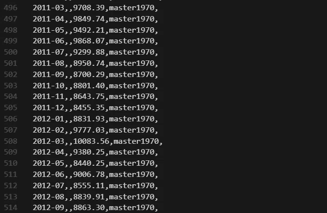 各プラットフォームに散らばった1970年1月からの日経平均株価週間のデータをインターネット上で取得し素材データとしてまとめています。今回の記事を書くにあたって、週間終値を月間終値へとまとめています。