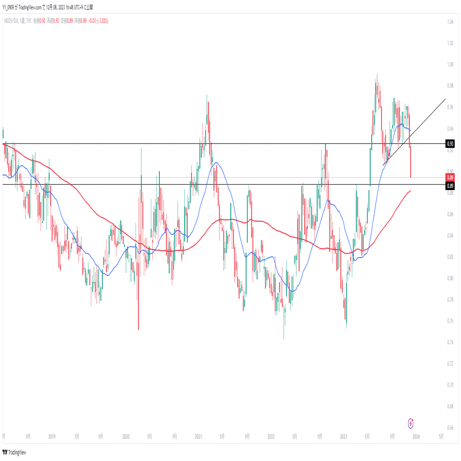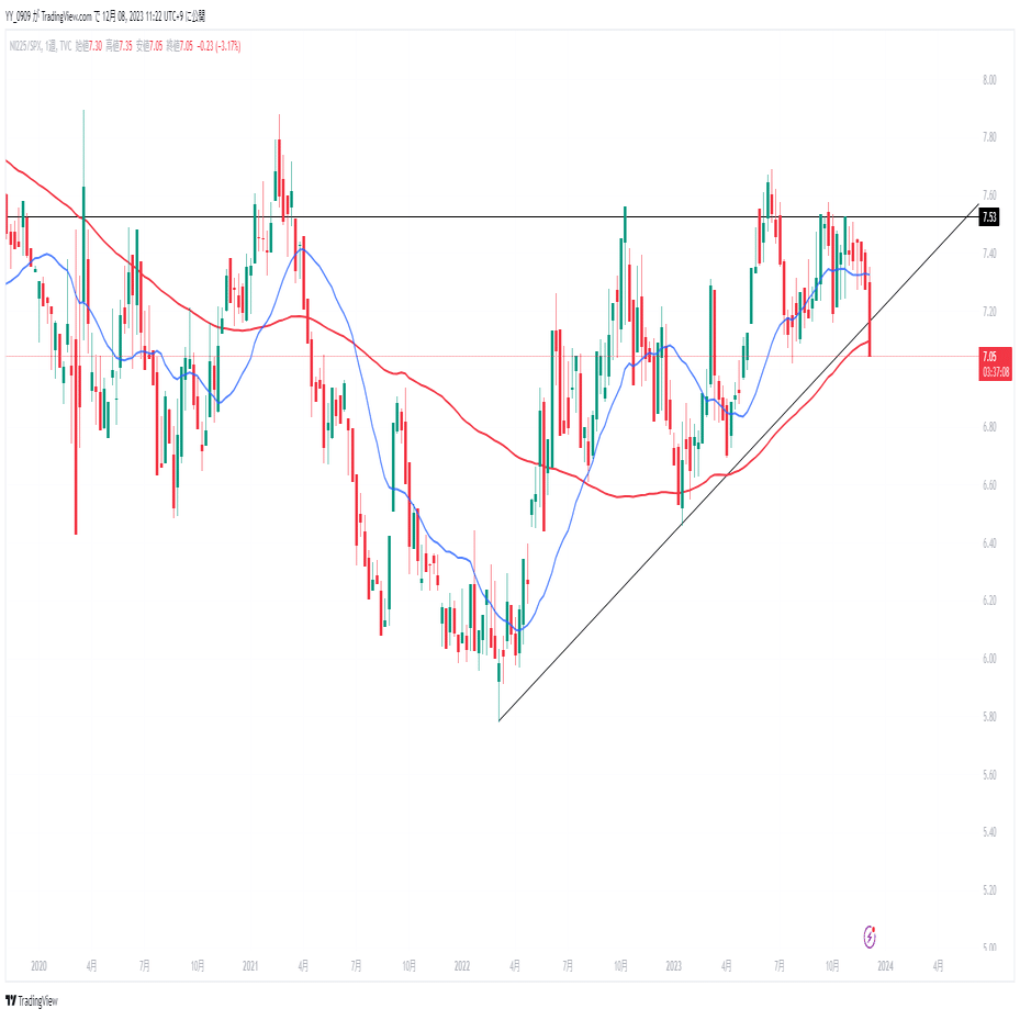 SP500、ダウは中期上昇トレンドラインや重要節目を割り込んでおり、ナスダックも重要節目に向けて下落している最中です。