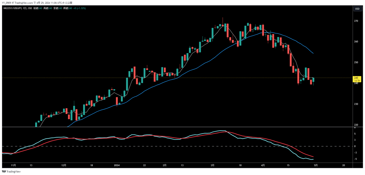 日経平均株価は基本的にドル円と相関していることは周知の事実ですが、ここ1ケ月半ほどは逆相関の関係にありました。※下画像参照