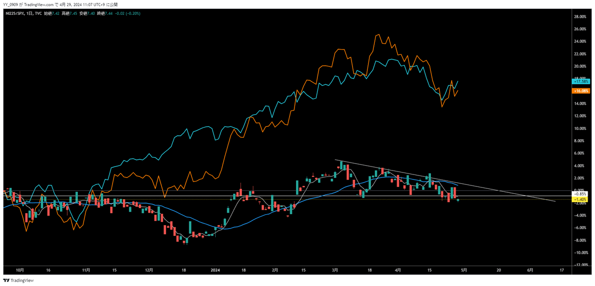 これはちょうど米国株も合わせてピークアウトした時期と重なっておりましたが、先週26日の日銀会合を通過した後のナイトの値動きから、また日経平均はドル円との正相関が戻ってきています。26日のNY市場は米国株価指数が伸び悩む中で日経先物は価格が上昇し、前回高値付近まで上昇しました。さらに29日の日中ではダブルボトムのネックラインを超えて推移しており、チャートの形状でみると短期的にS&P500をアウトパフォームしてきています。